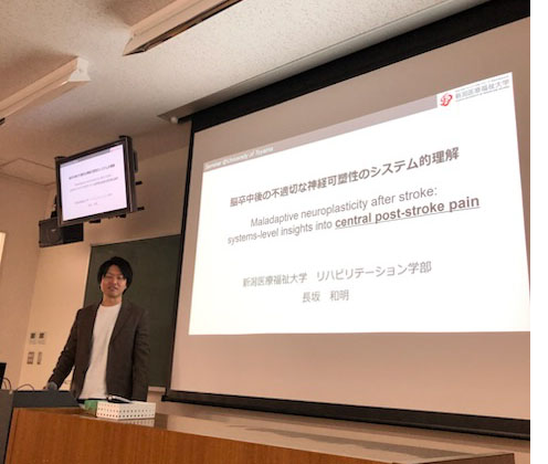 脳卒中などによって神経系に損傷が生じると、身体適応の過程として神経系には可塑的変化が誘導されることが知られており、これは我々がもつ機能回復のための重要な神経メカニズムと考えられています。しかしながら、この可塑性に伴う機能変化は必ずしも有益なものばかりではなく、例えば脳卒中後に麻痺などの運動機能の回復がみられた後、しばしば持続的な疼痛が出現することが知られており、臨床上の大きな課題となっています。本セミナーでは、長坂先生に、この痛みの解明を目指した基礎研究について、その歴史と背景、最新の知見について、特に先生自身が取り組んでいるげっ歯類の病態モデルの構築から、それらを対象とした機能・構造イメージングや薬理学的検証によって得られた最近の知見を概説いただきました。脳梗塞などの脳損傷によって神経系のシステムがどのようにダイナミックに再編成されるのかについて、その機能的な意義も含めて本学の大学院生をはじめとする参加者を交えて活発な議論が行われました。