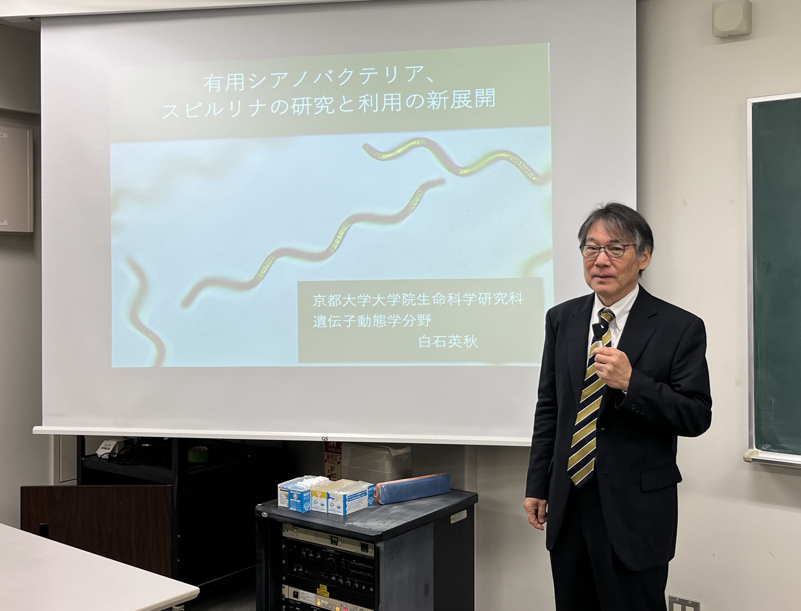 大学院生命融合科学教育部セミナーとして白石 英秋先生にご講演いただきました。多細胞の繊維状シアノバクテリアの一種であるスピルリナは古くから食用に利用され、らせん状の形態をとっていることが特徴です。好アルカリ性シアノバクテリアであるために、屋外の開放系の培養池を使い他の藻類が混入しない状態で大量培養でき、現在では食品や食品用天然着色料の原料として、商用生産が世界各地で行われています。 白石先生はスピルリナ株の凍結保存方法の確立や全長ゲノム塩基配列の決定など研究の基盤整備を行われ、その途上で、らせん状の形態に関与するタンパク質キナーゼとその遺伝子重複の重要性を見出されました。ご講演では、世界の食料問題の解決に貢献する食用素材の基礎研究基盤を一つ一つ整備されていくご努力と同時に、そこから基礎生物学的に重要な発見を導かれる研究力が印象的でした。生命融合以外の部局からのからの参加者もあり、和やかな雰囲気のセミナーでありつつ、予定時間を超えて活発に質疑応答もなされました。